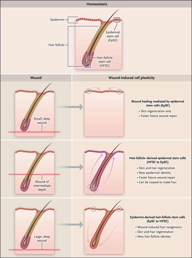 Cuando se producen lesiones de profundidad intermedia, las células madre del folículo piloso migran a la herida y adoptan la función, forma y el patrón de expresión génica de las células madre epidérmicas. Sin embargo, se ha observado que estas células mantienen una memoria epigenética que puede ser clave para mejorar su capacidad regenerativa.