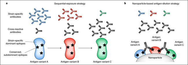 La primera se basa en la exposición secuencial del sistema inmunológico a antígenos relacionados de manera divergente que comparten epítopos conservados. La exposición al primer antígeno inducirá un cebado de bajo nivel de células B con especificidades para el epítopo inmunosubdominante. La re-inmunización con un antígeno distinto pero relacionado que comparte el epítopo inmunosubdominante conducirá entonces a una respuesta de memoria de esas células B cebadas, en lugar de una respuesta de novo a los epítopos específicos del antígeno (figura 1a). Este fenómeno se ha observado en la naturaleza cuando los humanos están expuestos secuencialmente a virus influenza divergentes, lo que da lugar a un aumento de anticuerpos que se dirigen principalmente al dominio conservado de HA. Las vacunas universales contra el virus de la influenza basadas en este fenómeno se están probando actualmente en ensayos clínicos (ClinicalTrials.gov NCT03300050 y NCT03275389).