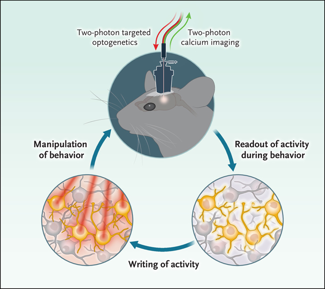 En los años transcurridos desde el annus mirabilis de 2005, se han producido notables avances en el campo de la optogenética. Ahora se tiene una paleta de opsinas microbianas, ambas derivadas de fuentes naturales y optimizadas mediante mutagénesis dirigida al sitio. Además de posibilitar la activación rápida y el silenciamiento de las neuronas mediante longitudes de onda y cinéticas, las opsinas también se han diseñado para permitir una inhibición optogenética más potente mediante el rediseño de los poros del canal para favorecer el flujo de cloruro, conferir la activación de la función escalonada y desencadenar la activación de cascadas bioquímicas. Se han desarrollado estrategias que implican la expresión viral (principalmente con el uso de vectores de virus adenoasociados) y la expresión transgénica para la expresión in vivo en tipos celulares específicos. El uso de la tecnología de diodos acoplados a fibra óptica, iniciada por el grupo Deisseroth, permitió la activación de neuronas específicas en las profundidades del cerebro de animales que se mueven libremente. El desarrollo de opsinas activables mediante iluminación de dos fotones permite que neuronas específicas se dirijan a patrones fisiológicos espaciales y temporales, y la expresión simultánea de indicadores de calcio y opsinas codificados genéticamente proporciona una estrategia "totalmente óptica" para la lectura y el control de los circuitos neuronales (figura 2). Esto ofrece la posibilidad de un control de la actividad en circuito cerrado, que podría proporcionar la base de nuevas interfaces cerebro-máquina.