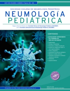 Órgano oficial de difusión de la Sociedad Chilena de Neumología Pediátrica (SOCHINEP) y de la Sociedad Latinoamericana de Neumología Pediátrica (SOLANEP) SOC I EDAD CH I LENA DE NEUMOLOG Í A PED I ÁTR I CA D i s p o n i b l e e n h t t p : / / w w w . n e u m o l o g i a - p e d i a t r i c a . c l N E U M O L O G I A P E D I ÁT R I C A MAYO 2 0 2 0 V O L UME N 1 5 N ÚME R O 2 P á g i n a s 2 8 9 - 3 6 8 CONTENIDO ACTUALIZACIÓN Y ENFRENTAMIENTO DE LA PANDEMIA POR SARS-COV-2 EN PEDIATRÍA • Epidemiología • Etiología y fisiopatología • Prevención y medidas de protección • Paciente con sospecha de CoVID-19 en la urgencia pediátrica • Clínica y diagnóstico • Interpretación de patrones radiológicos • Manejo de cuidados Intensivos • Conductas en pacientes en ventilación mecánica en domicilio • Tratamiento • Aspectos bioéticos D i s p o n i b l e e n LILACS ISSN 0718-333X (versión en línea, derechos reservados)